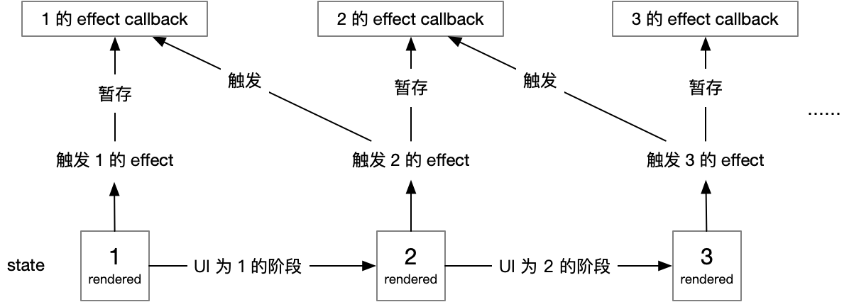 }这是不带清除函数的情况,真实的useEffect的清除函数在下一次更新时调用:
